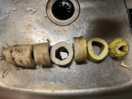 ![]() 中空ダイコン ダイコン2畝全収穫 ダイコンは3畝作ったが、そのうち2畝を全収穫。今年は、大きく育ったものが多かっ た。そのうち、変わったダイコンが上の写真。中空に上から下までなっている。よくよく 見ると、ダンゴムシが中におり食べてこうなったものか? 行った日の晩、体温が37.5度まで上がった。インフルにしてはそう高くないのだ が、念のため翌朝、近くの病院へ。車の中で待たされ、鼻から採取、インフルエンザA型 でした。薬を飲んだが、その日の午後、全てを嘔吐、きつかった。翌日は平熱、2日の待 期期間を取って20日に帰った次第。今年は感染力が強そう、マスクは必須。 |