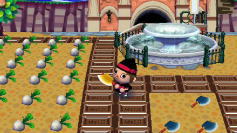 まぁまぁ 村に来る フレンドのみんなには 便利になったって 評判も良いんだし もー良いじゃない そして つぎに紹介するのは 噴水の前にある オノ置き場と そのとなりの カブ置き場ね |