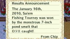 えと それでは最後に こないだの 釣り大会の結果なんだけど‥ みごと 3つの村の大会で優勝しました♪ ただ セーラムからの 結果報告が 英語のお手紙だったので ちょっと びっくりしちゃいました |