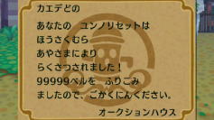 そして カエデが 今回のオークションに 出品してた 韓国アイテム ユンノリセットの結果は‥ なんと ほうさくむらの あやが 99999ベルで落札! |