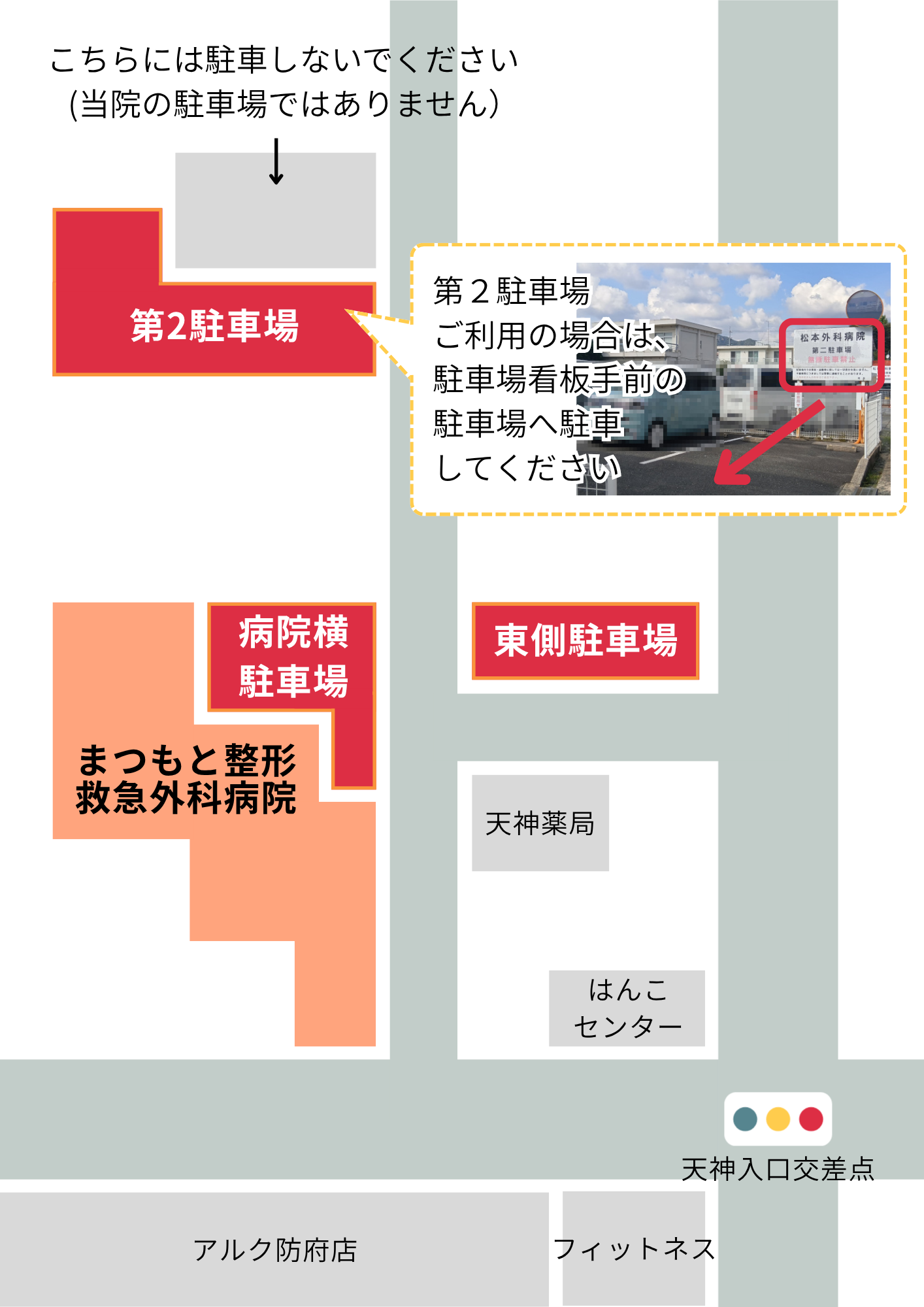駐車場は病院横に12台、病院東側(天神薬局のとなり側)に13台、病院から少し北側に進んだところに第2駐車場がございます。